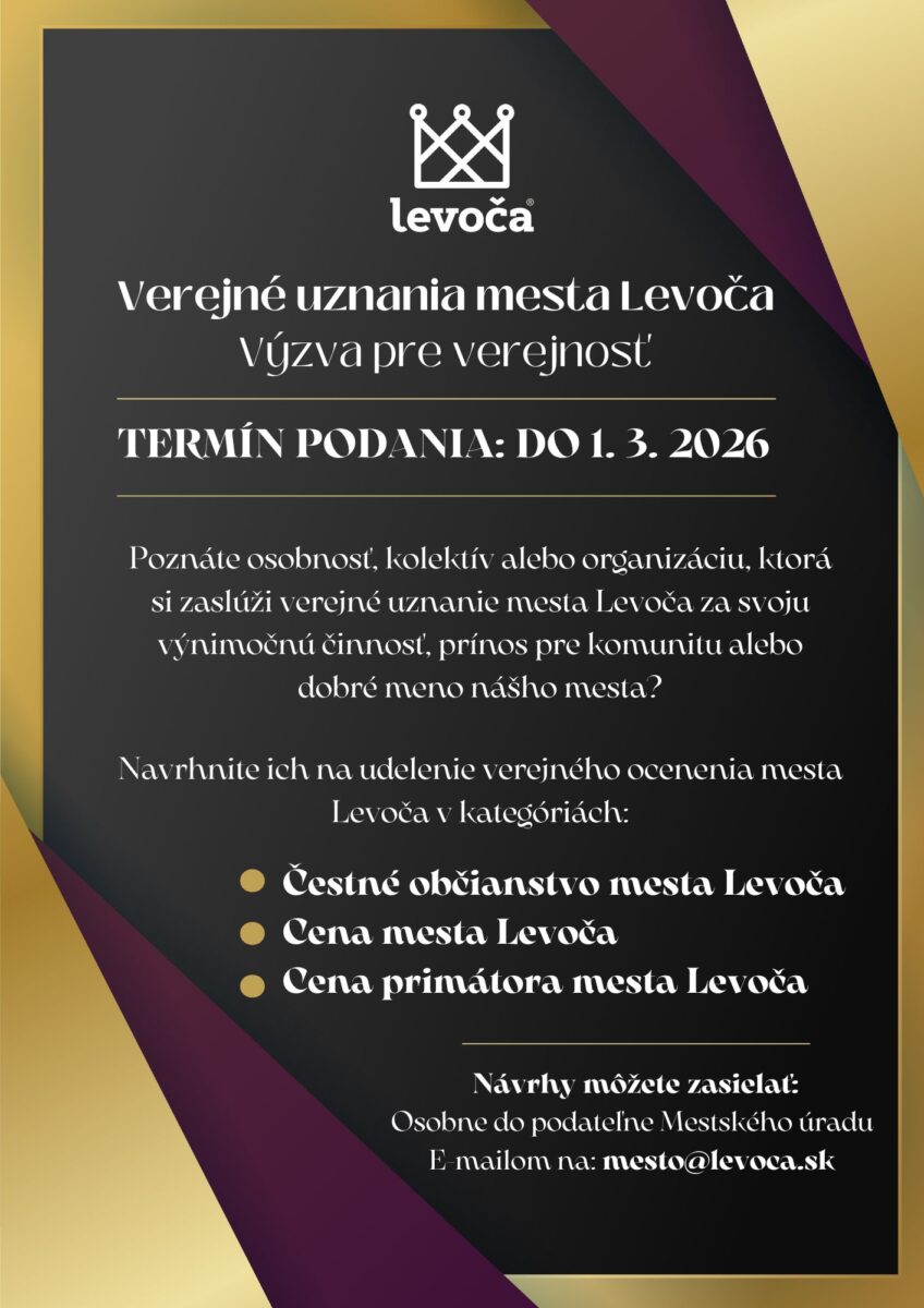 Návrhy je možné podávať do podateľne MsÚ, prípadne e-mailom na adresu mesto@levoca.sk, Mgr. Dagmar Spišská – sekretariát MsÚ do 1. 3. 2026.