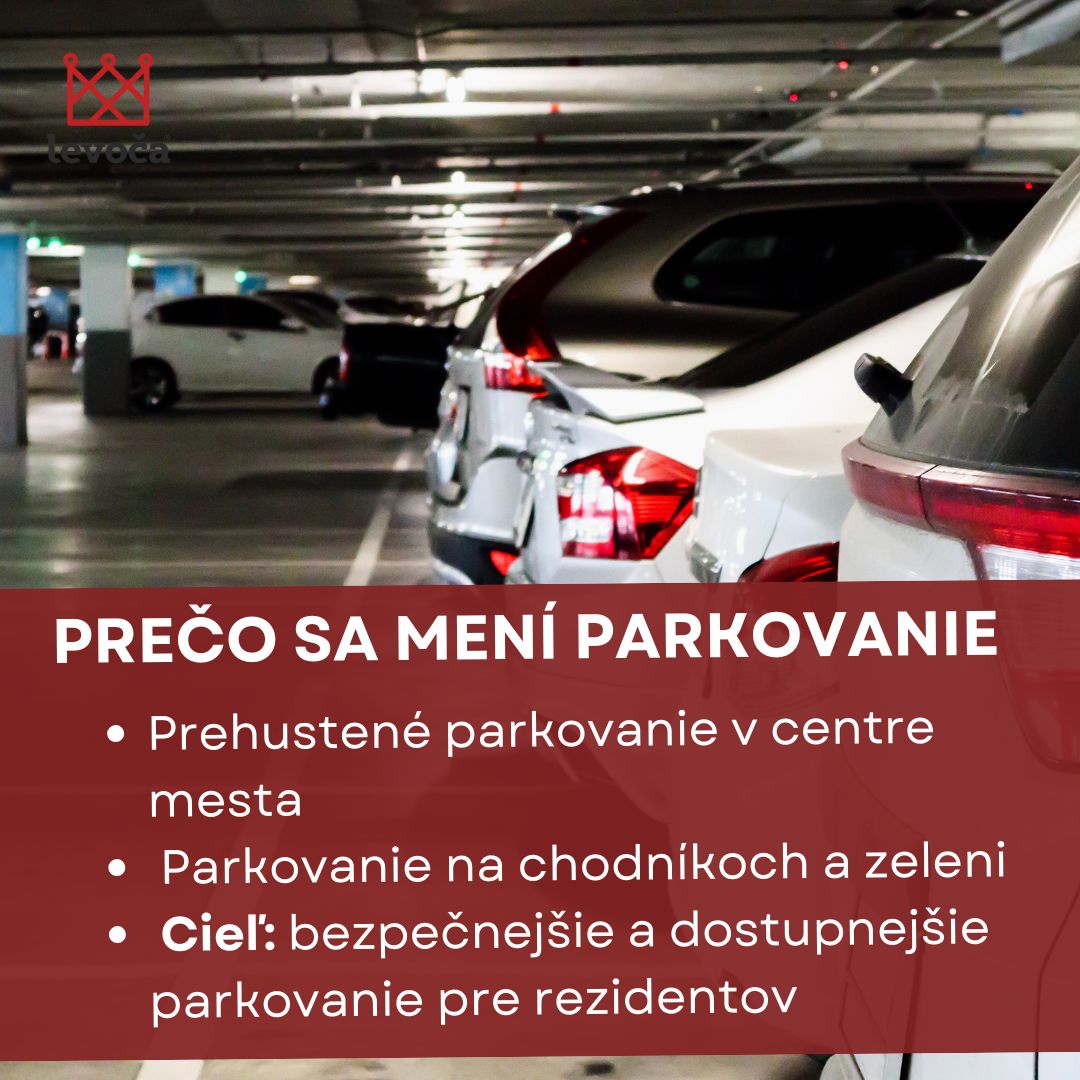 Dôvodom rozšírenia regulovaného parkovania je dlhodobo prehustená statická doprava v centre mesta, spôsobená najmä celodenným parkovaním vozidiel počas pracovných dní. Dochádza k častému parkovaniu na chodníkoch, zelených plochách a v blízkosti križovatiek, čo negatívne ovplyvňuje bezpečnosť dopravy, plynulosť premávky a kvalitu verejného priestoru. Cieľom mesta je zlepšiť dopravnú situáciu, efektívnejšie využívať parkovacie kapacity a zvýšiť dostupnosť parkovania pre rezidentov.
