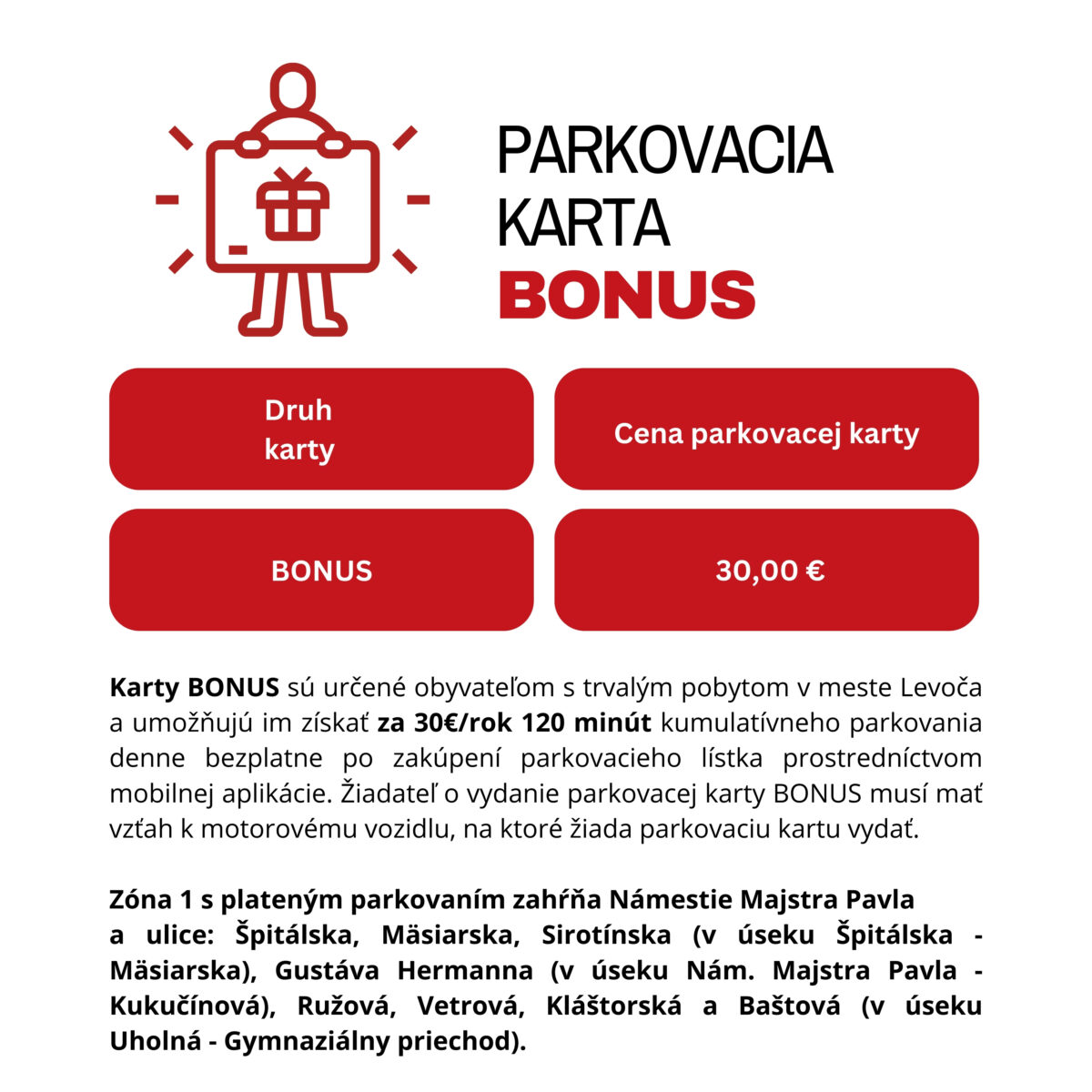 - karta BONUS ponúkne až 120 minút parkovania denne