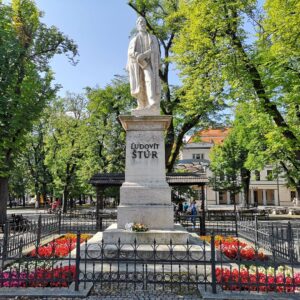 Ľudovít Štúr, zakladateľ slovenského spisovného jazyka, politik, básnik a publicista 19. storočia. Socha v parku dokumentuje spätosť Levoče so štúrovcami, ktorí na protest proti zosadeniu Ľudovíta Štúra z katedry odišli z Bratislavy na levočské evanjelické lýceum. Slávnostne bola odhalená v roku 1949 na počesť 100. výročia revolučného obdobia. Jej autorom je akademický sochár František Gibala.