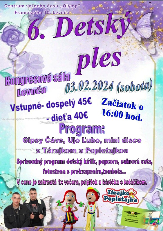 Centrum voľného času „Olymp“ vás pozýva na 6. Detský ples v Kongresovej sále, v Sobotu 3. 2. 2024 o 16:00 hod.
