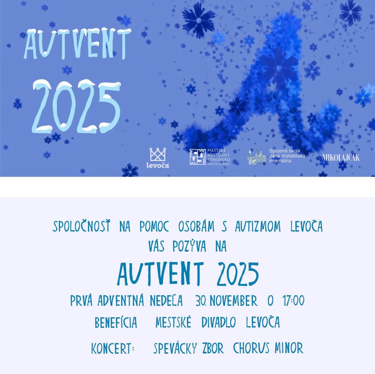 Pozývame vás na dobročinné podujatie AUTVENT 2025, ktoré už tradične prináša spojenie adventnej atmosféry, solidarity a podpory ľudí s autizmom v Levoči.