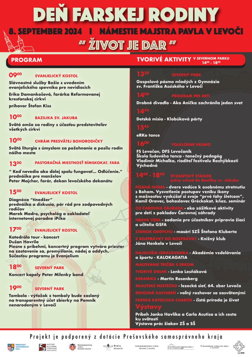 Deň farskej rodiny s témou „Život je dar“ sa uskutoční v nedeľu 8. septembra 2024 v Severnom parku na Námestí Majstra Pavla.
