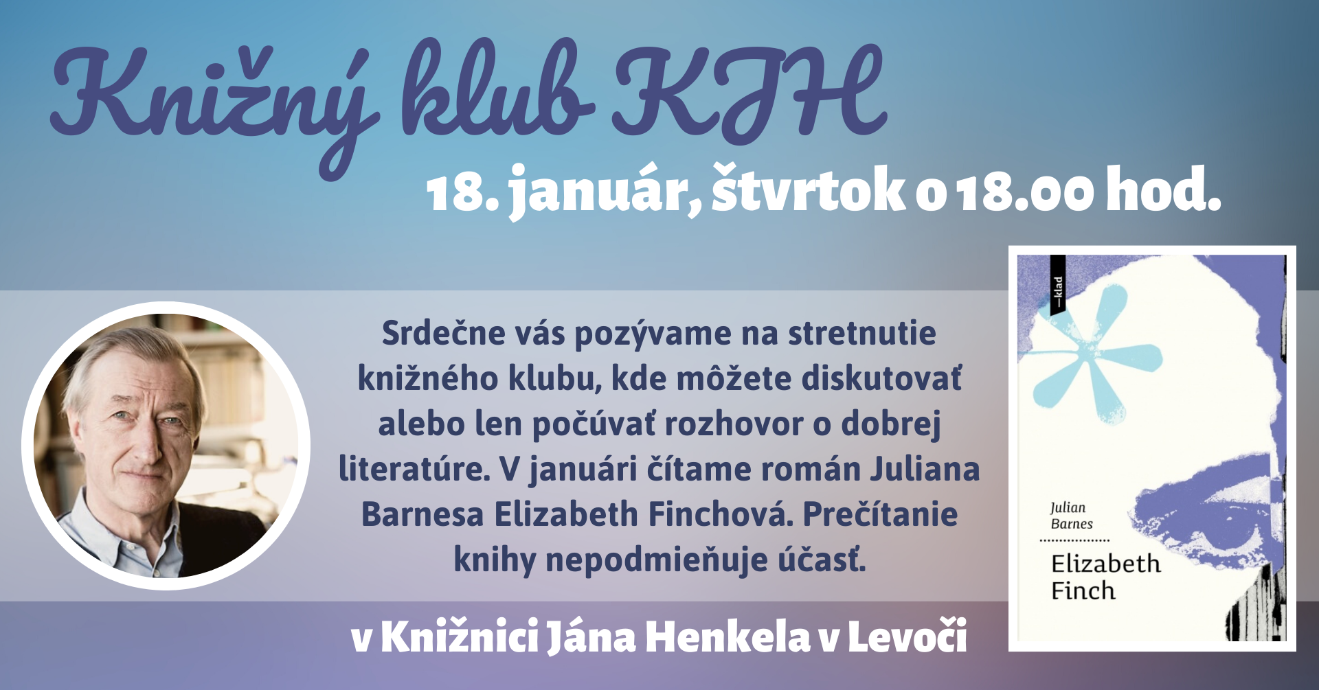 Srdečne vás pozývame na stretnutie knižného klubu, kde môžete diskutovať alebo len počúvať rozhovor o dobrej literatúre. V januári čítame román Juliana Barnesa Elizabeth Finchová. Prečítanie knihy nepodmieňuje účasť.