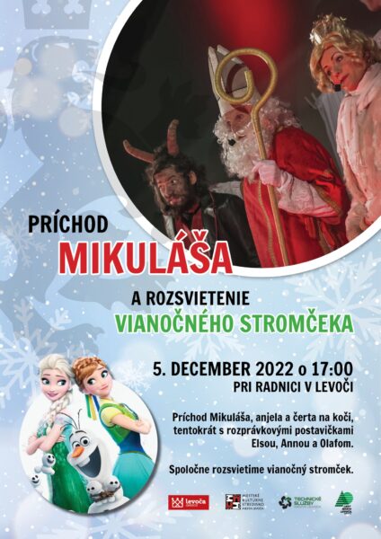 Po dvoch rokoch sa opäť stretneme pri radnici v Mesto Levoča a privítame spolu Mikuláša so svojimi pomocníkmi – anjelom, čertom a tentokrát aj s rozprávkovými postavičkami Elsou, Annou a Olafom. Čaká nás malé predstavenie, vyvrcholením ktorého bude spoločné rozsvietenie krásneho vianočného stromčeka , ktoré zabezpečili Lesy mesta Levoča a vyzdobili Technické služby Mesta Levoča.