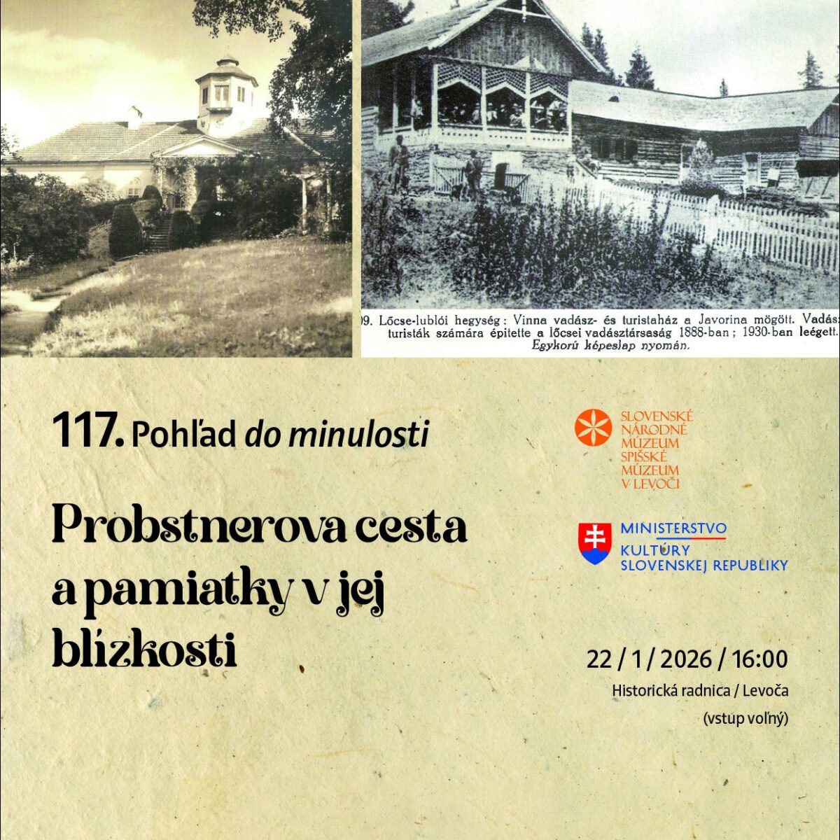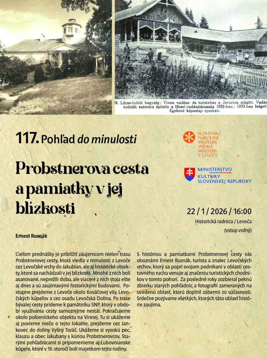 Pozývame vás na jedinečnú prednášku „Probstnerova cesta a pamiatky v jej blízkosti“, ktorá vás zavedie po stopách zabudnutej historickej trasy z Levoče do Jakubian – krajiny, kde sa stretáva príroda, architektúra a pamäť minulých generácií.