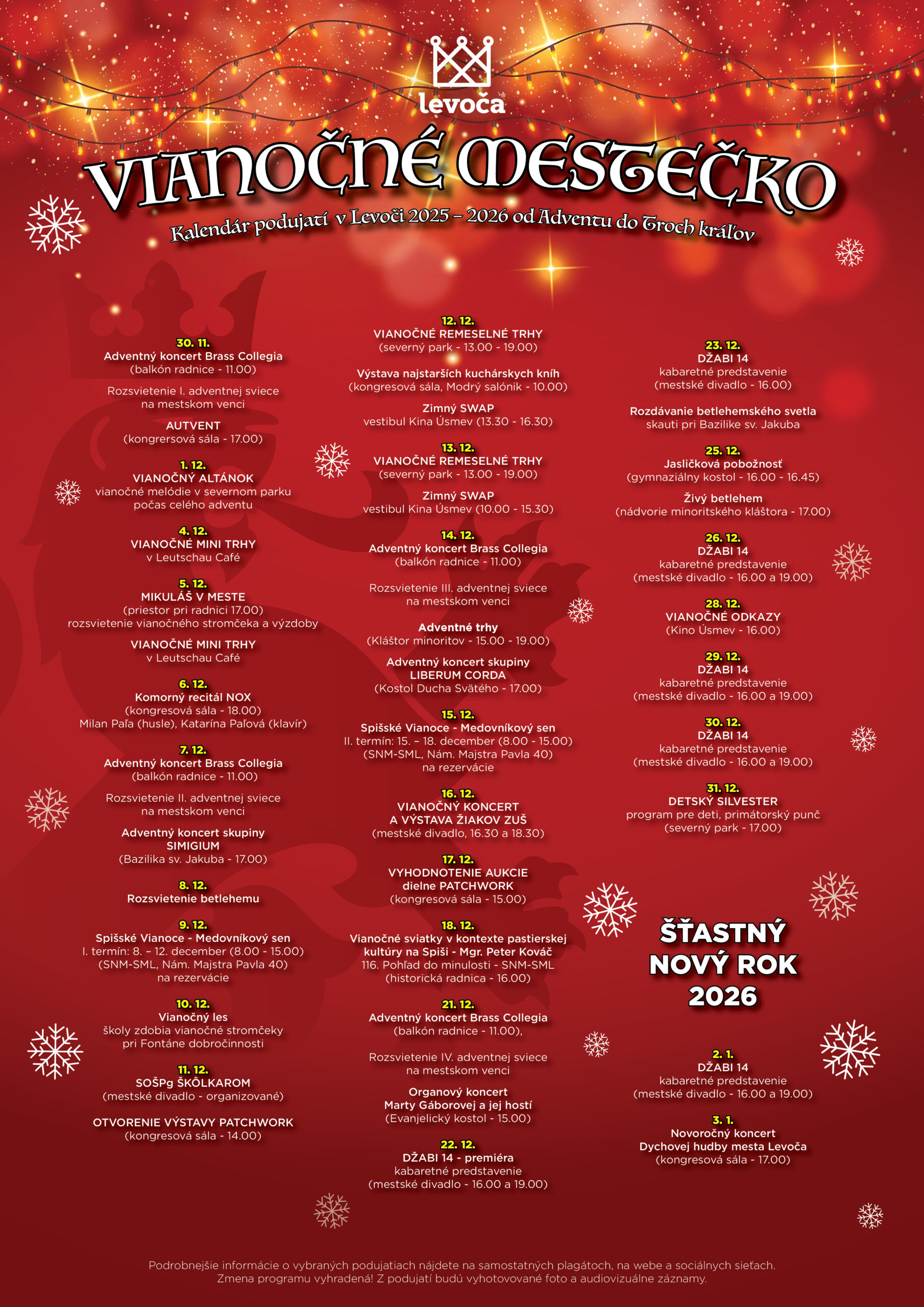 Pripravili sme pre vás kalendár podujatí v meste Levoča od ADVENTU do TROCH KRÁĽOV.