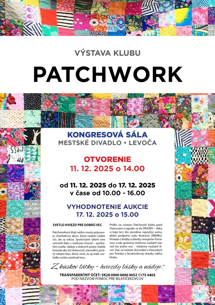 Príďte na výstavu Patchwork klubu pred Vianocami a zapojte sa do DRAŽBY – deku si kúpi ten, kto ponúkne najvyššiu sumu, alebo podporte našu finančnú ZBIERKU. Peniaze z dražby a zbierky venujeme Tomášovi, a tak spoločne môžeme rozžiariť viac než len jednu noc – môžeme rozžiariť život. Viac sa môžete dozvedieť o Hviezdach pre Tomáša z facebookovej stránky nášho klubu.