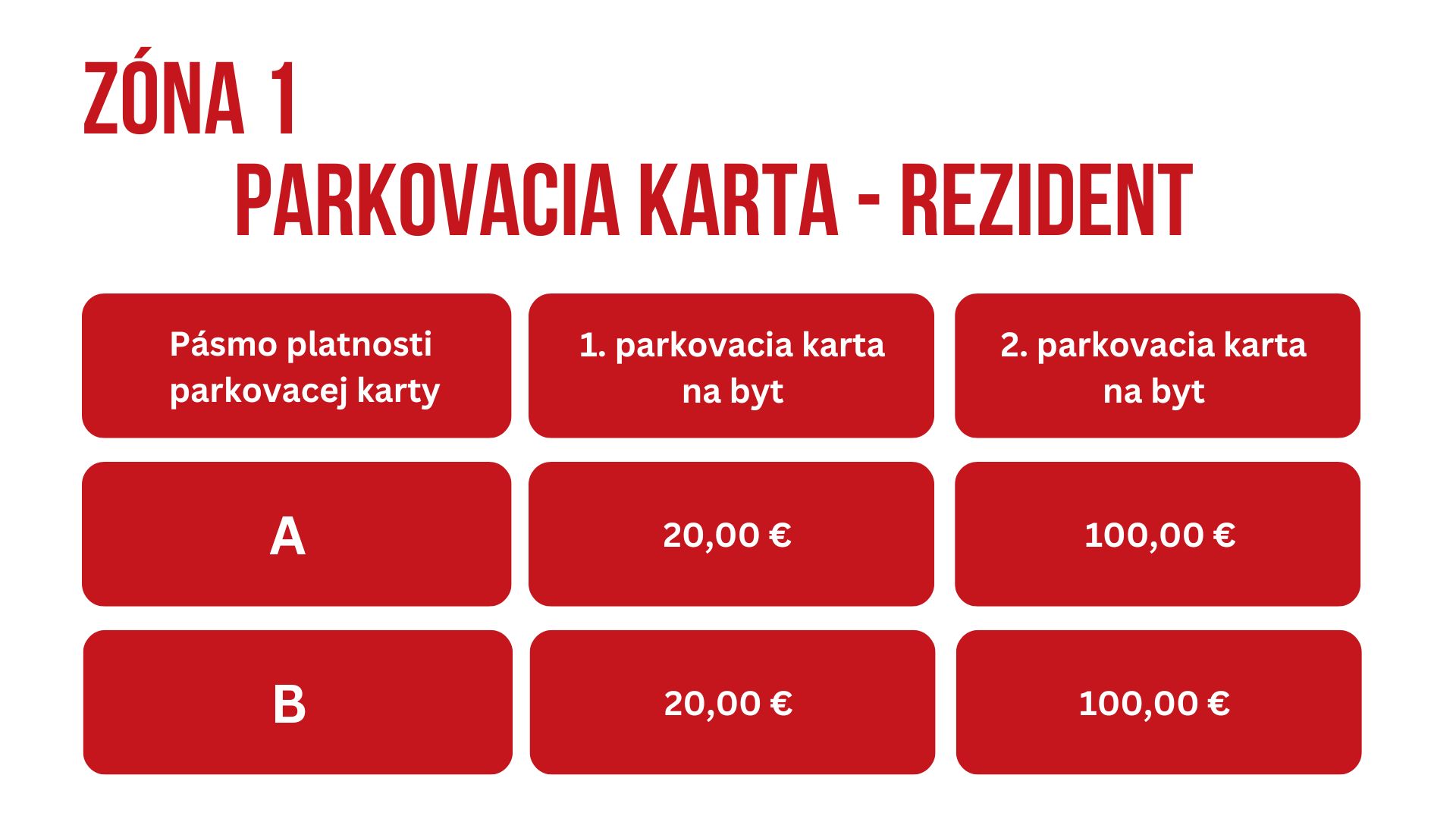 Rezidentské karty sú určené pre parkovanie motorových vozidiel obyvateľov, ktorí majú trvalý pobyt v zóne s plateným parkovaním v príslušnom pásme platnosti parkovacej karty. Rezident musí mať vzťah k motorovému vozidlu, na ktoré žiada parkovaciu kartu vydať. Ako rezident máte možnosť za 20€/rok parkovať kdekoľvek v zóne svojho trvalého bydliska a 100/200/750 voľných hodín pre vaše návštevy. Či už za vami prídu priatelia, rodina, alebo opravár, môžete im poskytnúť bezplatné hodiny na parkovanie.