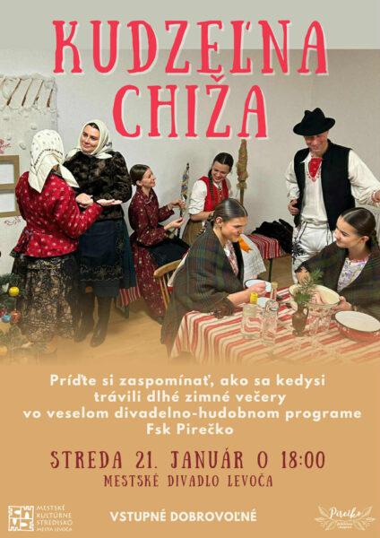 Humorný divadelno-hudobný program folklórnej skupiny Pirečko. Tak ako každý rok, aj tentoraz FSK Pirečko pripravila sezónny program, v ktorom si spoločne pripomenieme, ako sa kedysi trávilo zimné obdobie. Dlhé zimné večery patrili spriadaniu ľanu, no zároveň boli výnimočnou príležitosťou stretávať sa, pospievať si, rozprávať a zabaviť sa.Presne takúto atmosféru vám prinesie Kudzeľna chiža – humorný divadelno-hudobný program, v ktorom ožijú staré časy, ľudové tradície, spev aj prirodzený humor. Príďte si zaspomínať na minulosť alebo objaviť, ako vyzerali pravé zimné večery v kruhu komunity.