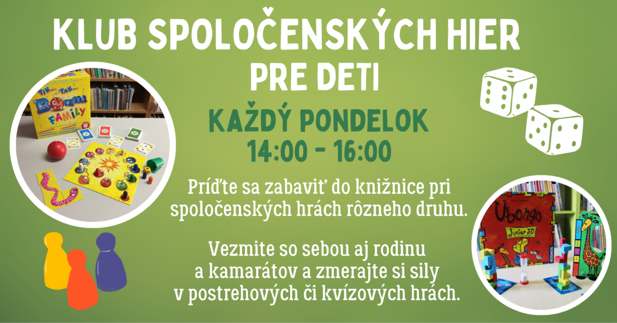 Každý pondelok – KLUB SPOLOČENSKÝCH HIER PRE DETI – 14.00 – 16.00 hod – Knižnica Jána Henkela v Levoči