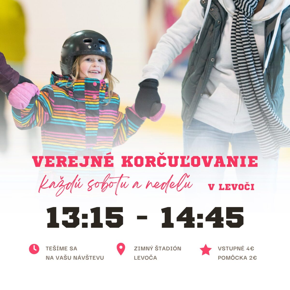 - Každú sobotu a nedeľu – VEREJNÉ KORČUĽOVANIE – 13.15 – 14.45 hod – Zimný štadión Levoča